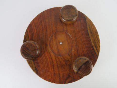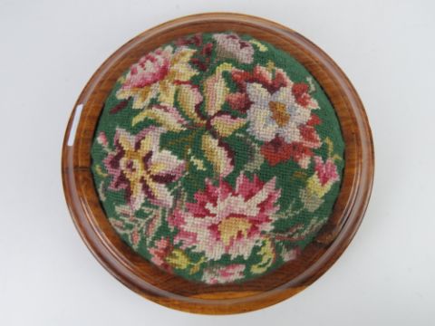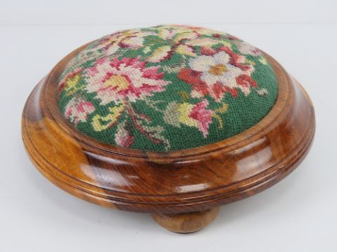A contemporary circular needlepoint footstool in yew wood raised over three bun feet, 28cm wide.