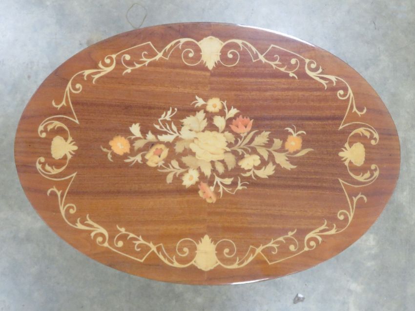 A 20th century inlaid musical occasional table having lid lifting to reveal compartment within, 57 x 39 x 56cm.