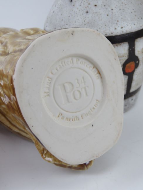 A West German pottery jug standing 23cm high, together with a West German pottery vase (slightly a/f) standing 15cm high and a Penrith Pottery vase in the form of a bird. Three items.