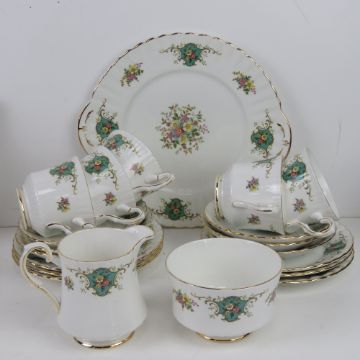 Two part tea services, one by Royal Stafford comprising cake plate, milk jug, sugar bowl and trios, the other in orange and cream ground.