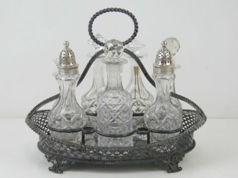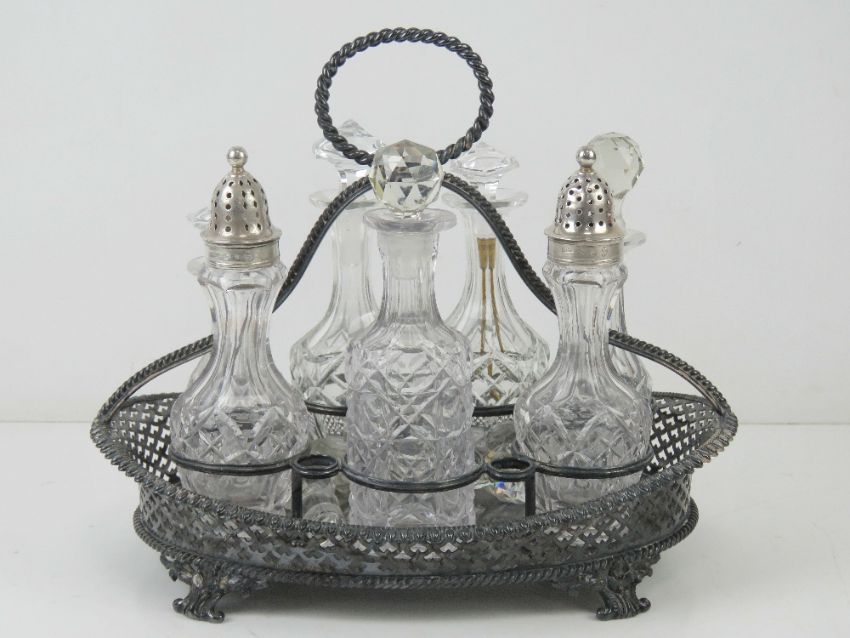 A large silver plated and cut glass cruet set having two cut glass sugar castors with HM silver tops and five assorted oil and vinegar bottles, 27cm wide.