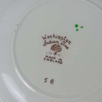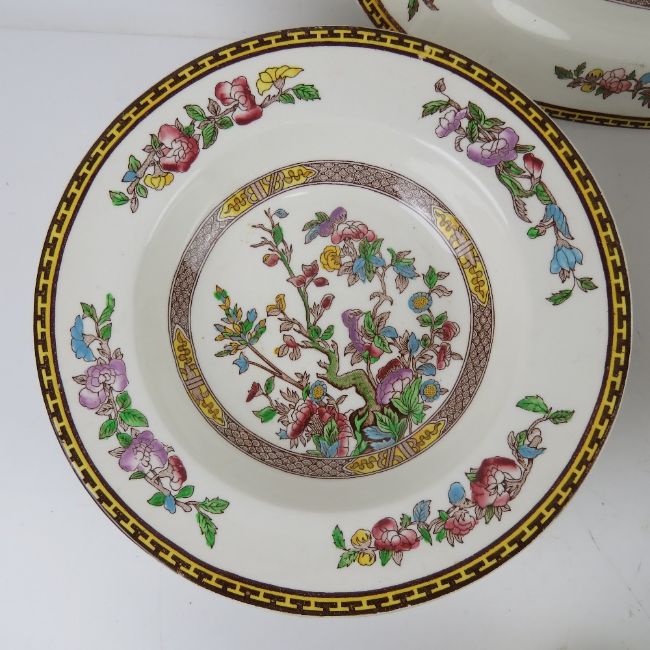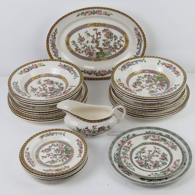 A quantity of Washington Indian Tree pattern dinnerware including dinner plates, salad plates, side plates, bowls, sauce boat and serving plate. Together with two other Indian Tree pattern plates.