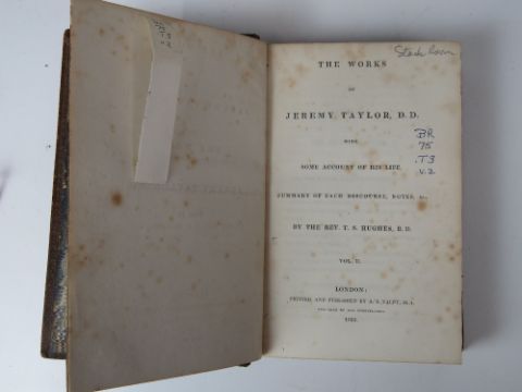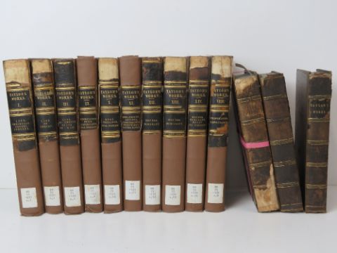 Books; Taylor's Works 'the whole works by the Right Rev Jeremy Taylor' in ten assorted volumes. Leather full bound. Published London 1828. a/f. Together with three other volumes of the same work published London 1831. Ex-Libris Cathedral and Abbey of St Alban.