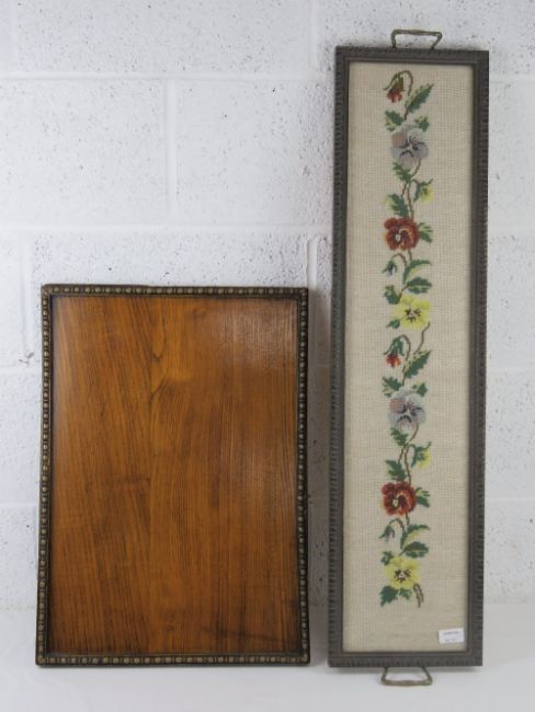 A good oak tray c1930s, measuring 58 x 41cm together with a glazed needle point panel, framed and complete with end handles, measuring 93 x 23cm.