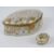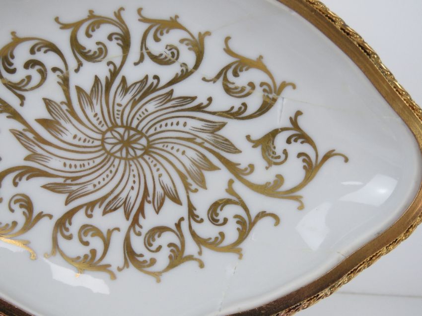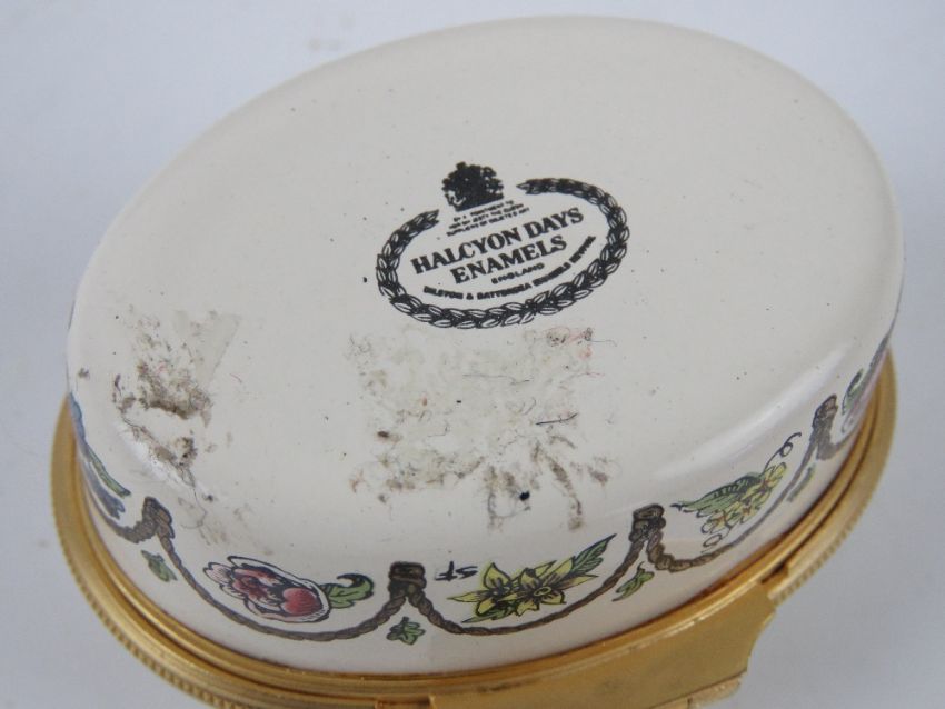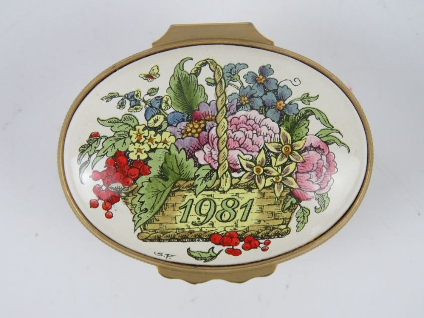 A Halcyon Days enamel trinket box '1981 A Year to Remember', together with a French dressing table porcelain trinket box having gilt decoration and measuring 18.5cm wide, a/f. Two items.