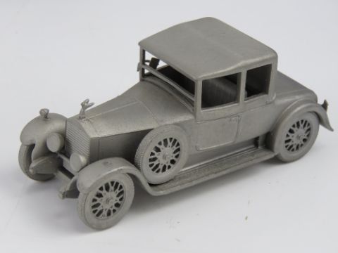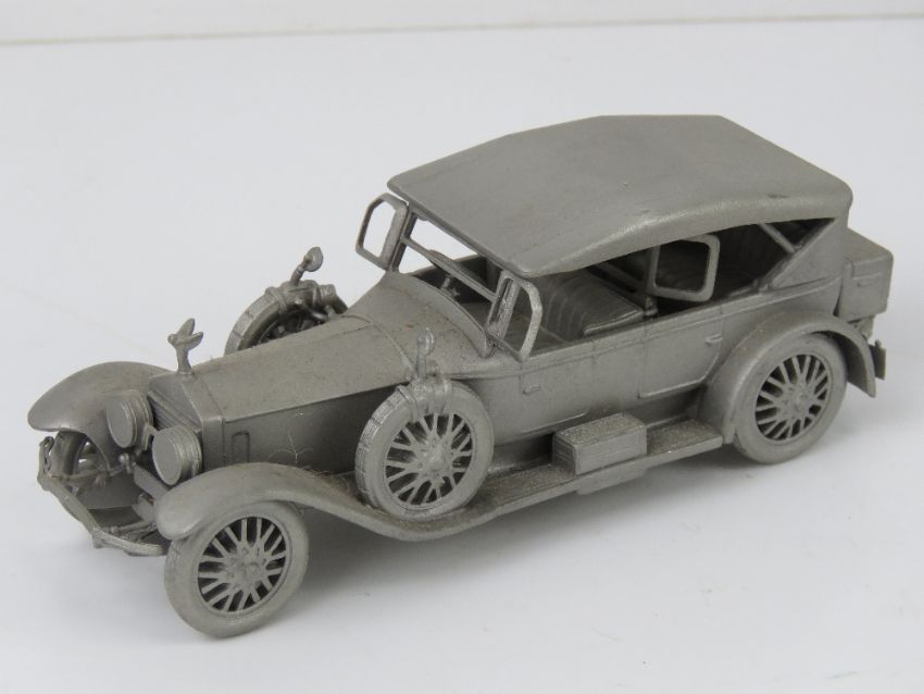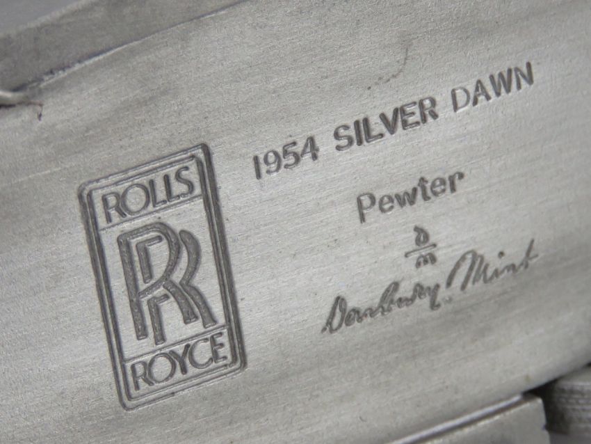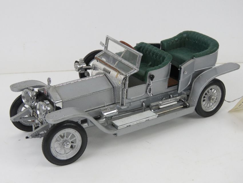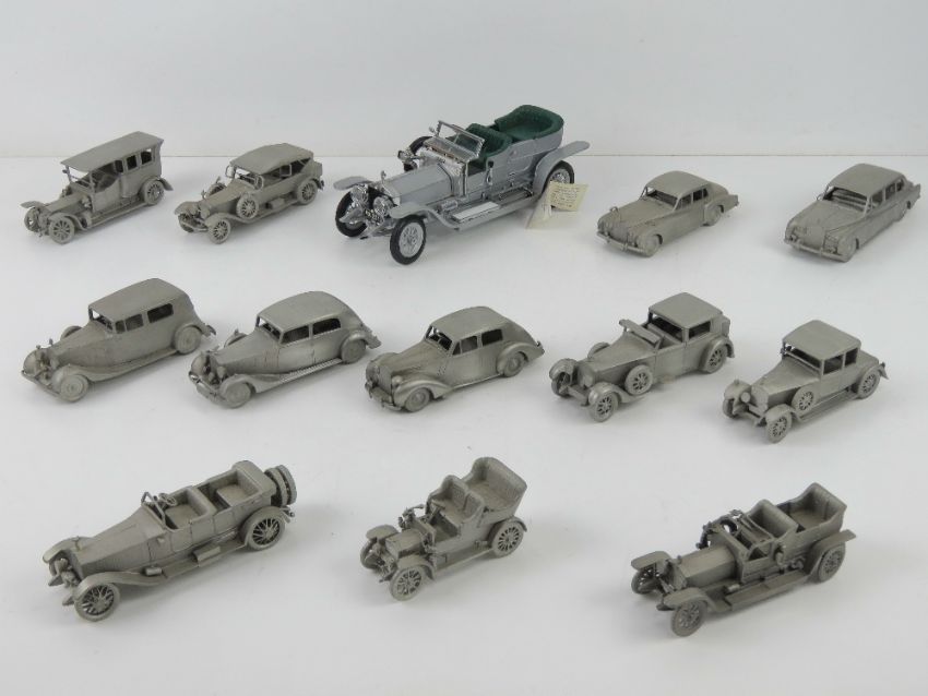 A collection of Rolls Royce scale model vehicles in pewter by Danberry Mint including; 1930s Phantom II, 1954 Silver Dawn, 1907 The Silver Ghost, 1939 Wraith, 1968 Phantom VI, 1936 Baby Rolls, etc. Twelve items. Also a Franklin Mint Precision Models '1907 Rolls Royce Silver Ghost'.