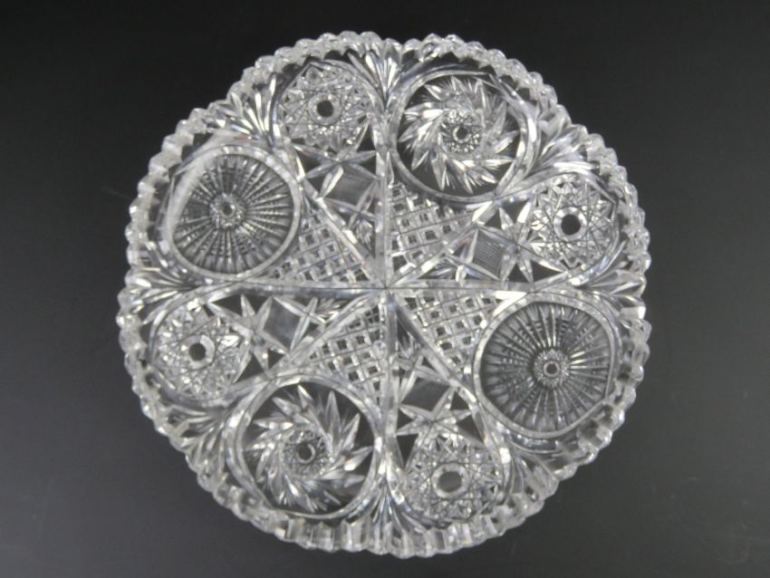 A lead crystal heavy cut glass two sectional lily vase, containing a quantity of glass beads, 28cm high. Together with an associated lead crystal cut glass circular stand 31cm dia.