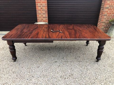 A good wind-out extending mahogany dining table. Three drop-in leaves, one measuring 55cm, two measuring 27cm. All raised over cup and cover legs upon brass castors. 240 x 120 x 74cm.