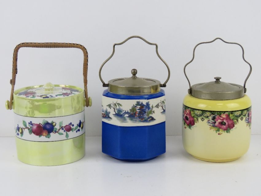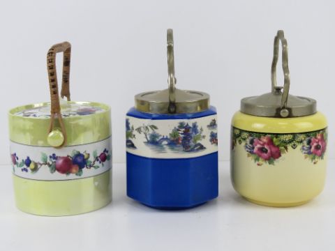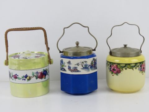 Three transfer printed wafer / biscuit barrels, each with nickel plated lids and handles c1950s.