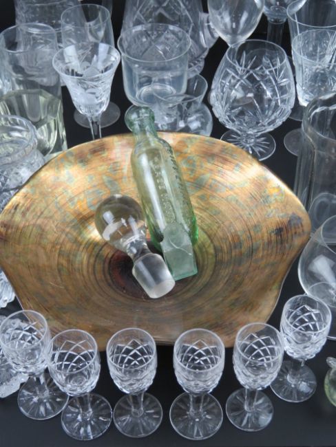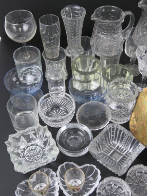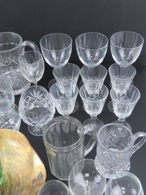A quantity of assorted glassware including; Waterford Crystal cut glass small bowl, 10cm dia, with matching vase standing 10.5cm high, a Royal Brierley Crystal liqueur glass, cut glass water jug, liqueur glasses, lidded pots, tot cups, etc.