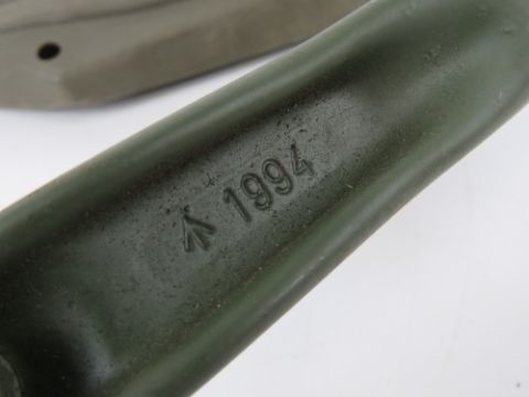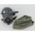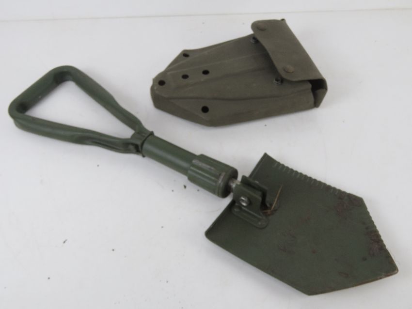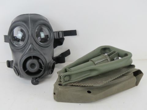 A folding Gulf War period entrenching tool in case, together with a British S10 rubberised Gulf War respirator. Two items.