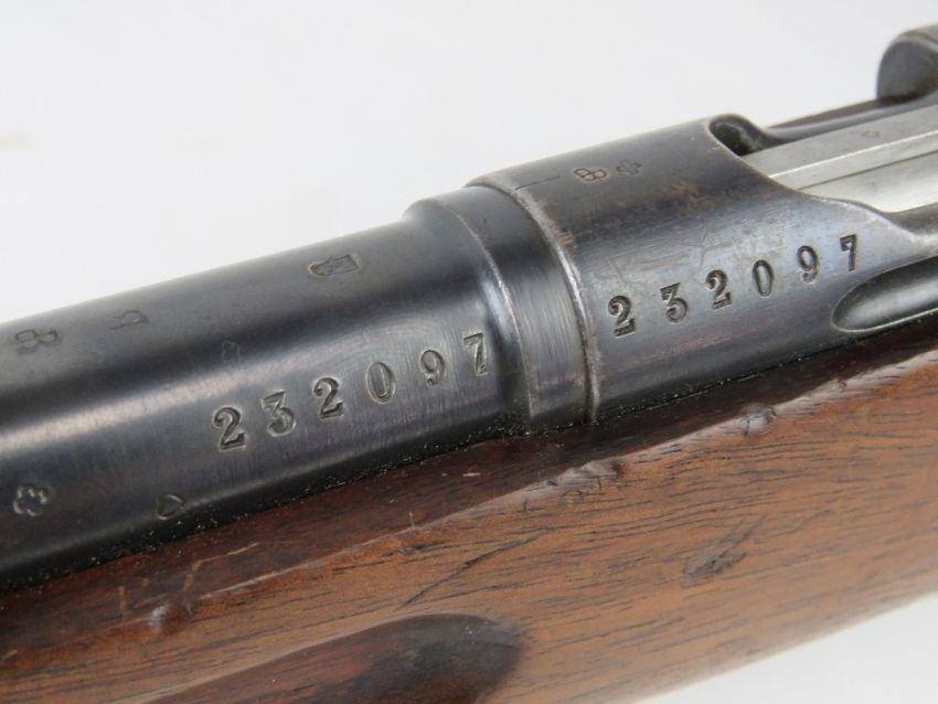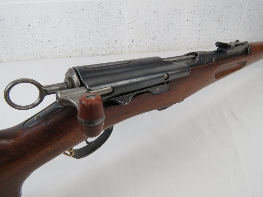 A deactivated Swiss Schmidt-Rubin 7.5mm straight pull Rifle with matching numbers magazine, receiver and bolt. ST-32354 SN232097. With EU certificate.