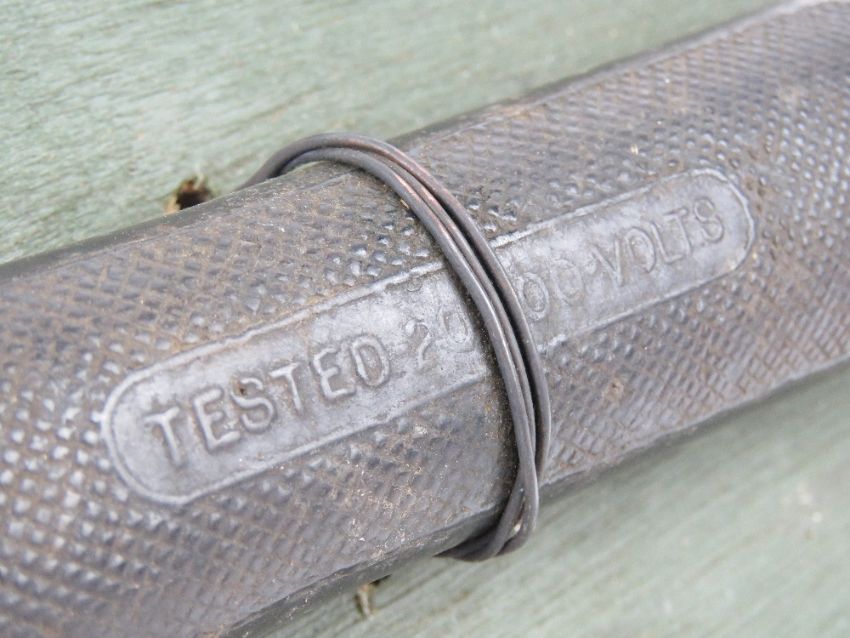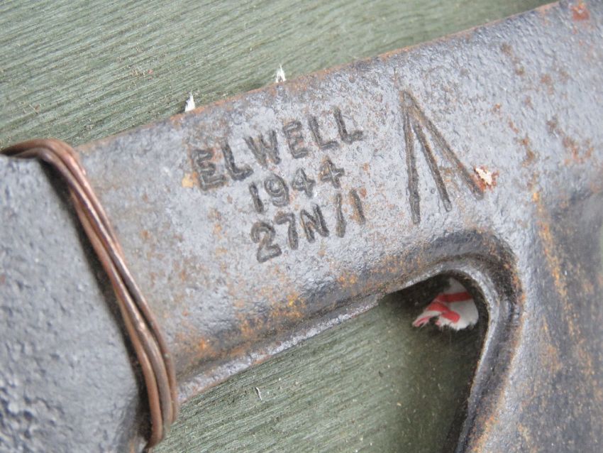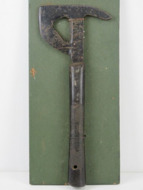 A WWII RAF Lancaster Bomber escape hatchet, having broad arrow upon, marked Elwell and dated 1944. Mounted on board for display purposes, board measuring 45.5 x 20.5cm.