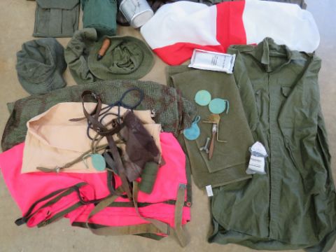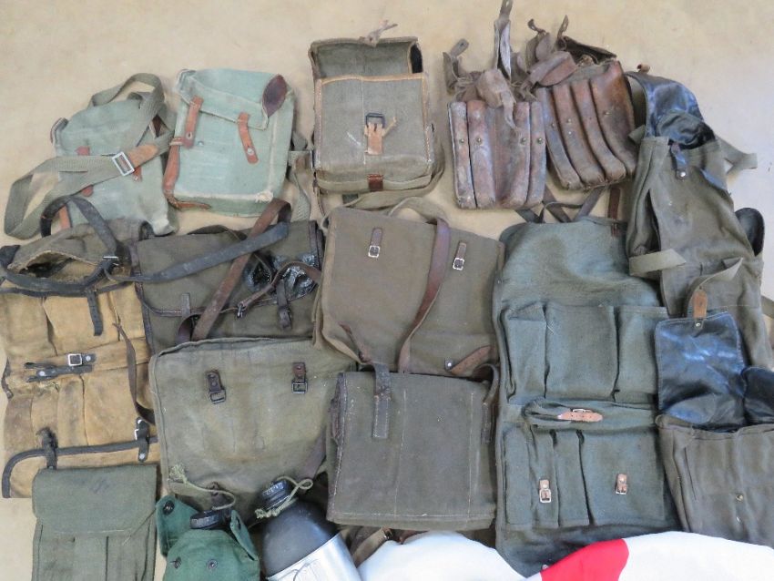 A quantity of assorted militaria, RPG pouches, PPS 43 magazine pouch, ZB26 magazine pouch, water bottle with canteen, Webley lanyard, jungle hats, large convoy marker, water bottle in pouch, shamags, British flag, sleeping bag in packet, FM33 filter, MG42/53 gunners pouches, M56 pouches, slings and AK pouches.