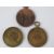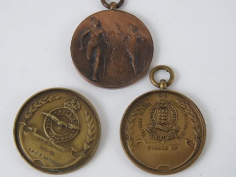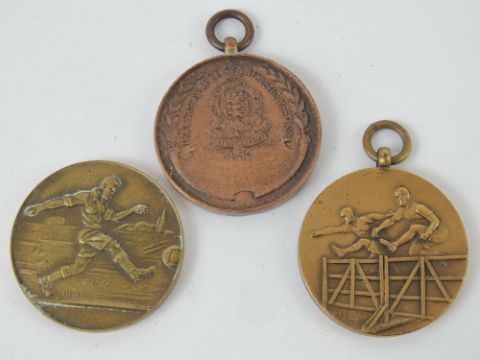 An Army Services pocket watch having white and silvered dial with subsidiary seconds dial, hands a/f. Together with three military themed sports medallions two being for Royal Army Ordinance Corp, and a gilt embroidery cloth badge. Five items.