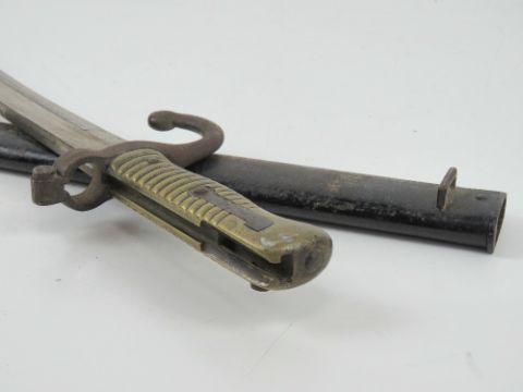A French 1871 Pattern bayonet having 57.5cm blade, brass grip and hook quillion, with scabbard.