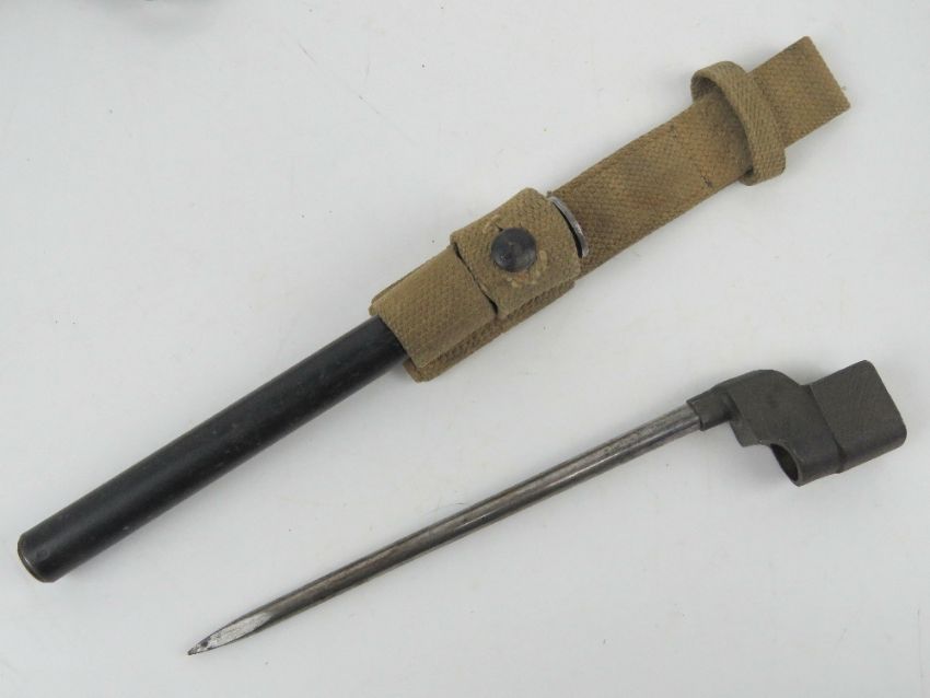 A French 1871 Pattern bayonet, having 57.5cm blade, brass grip and hook quillion. Together with a No.4 spike bayonet with rare tubular scabbard and canvas frog. Two items.