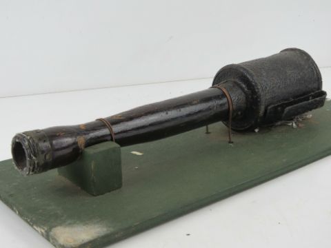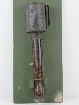 An inert WWI German stick grenade, mounted on board for display purposes, board measuring 42 x 18cm.