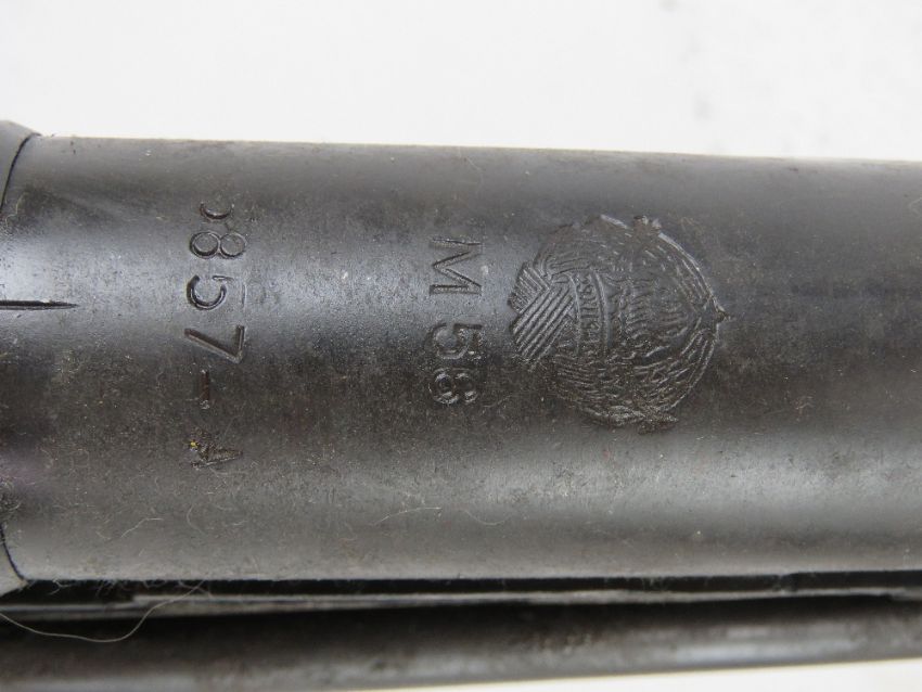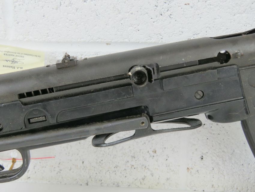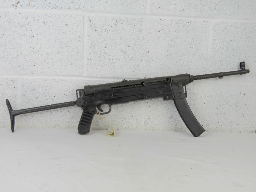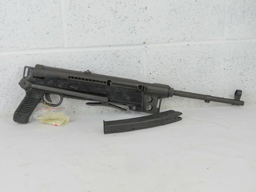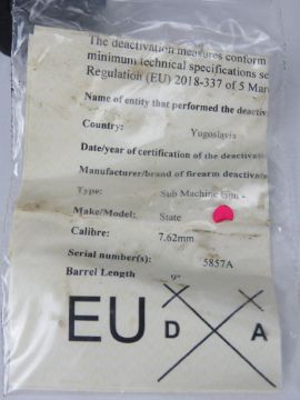 A deactivated Yugoslav M56 7.62mm sub machine gun, SN-5857A, with EU certificate. Together with M56 sub machine gun accessories being; bayonet and scabbard, four M56 magazines in leather pouch with carry strap and leather sling with fastening tab. SN-5857A.