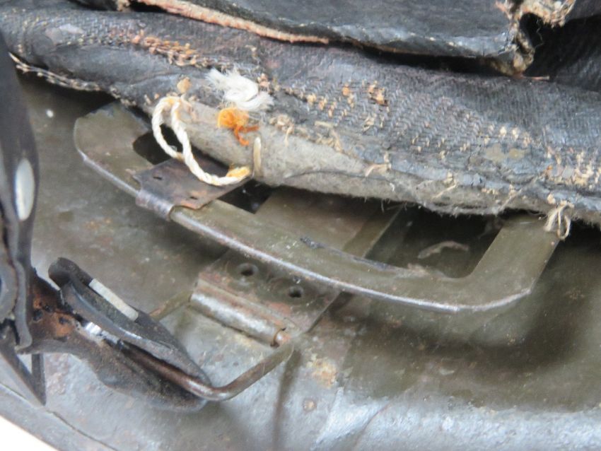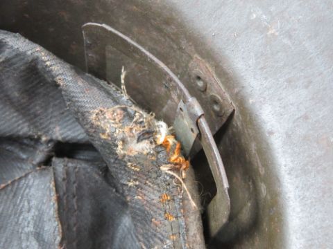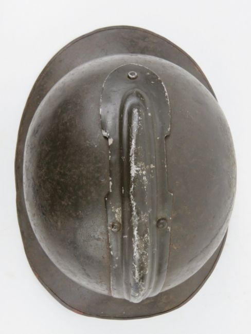 A French 1939-1943 helmet having liner and chin strap, badges removed.