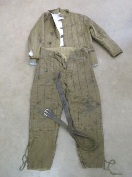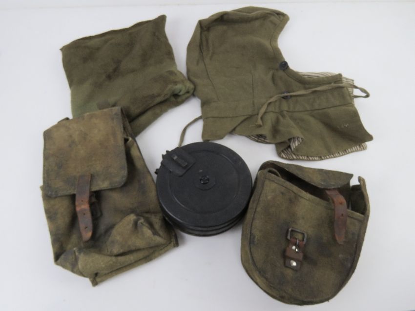 A near complete WWII Russian uniform including rare white, lightweight cotton camouflage snow over-trousers and over-smock, padded trousers and jacket (trousers stamped and dated inside), webbing with pack and ammo pouches, traditional Russian Valenki felt boots, PPSH magazine with pouch, woolen cap/hat.