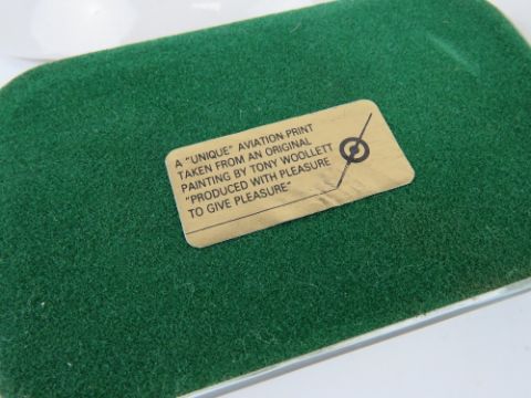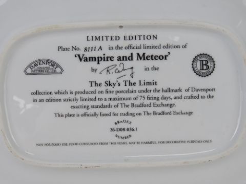 A limited edition Bradford Exchange decorative plate featuring The Vampire and Meteor Aeroplanes from The Sky's the Limit Collection. Together with two reproduction Wade decorative pin dishes featuring the Bristol Britannia and the D8 Comet. Also a glass paperweight having aviation theme. Four items.