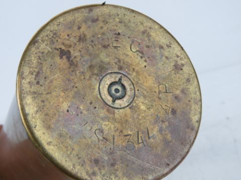 An inert WWI French 75mm shrapnel shell, indistinct date, marked L344 14 P to the shell. Standing 60cm high.