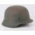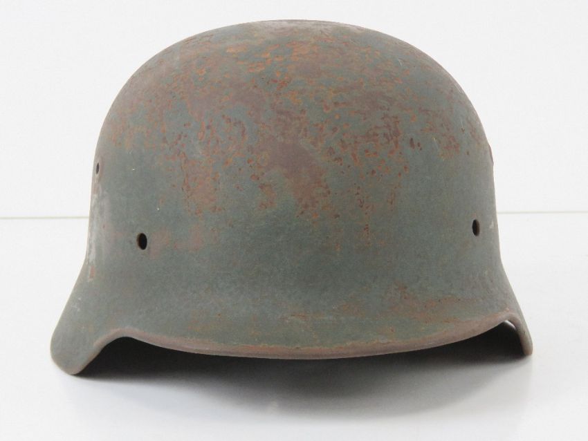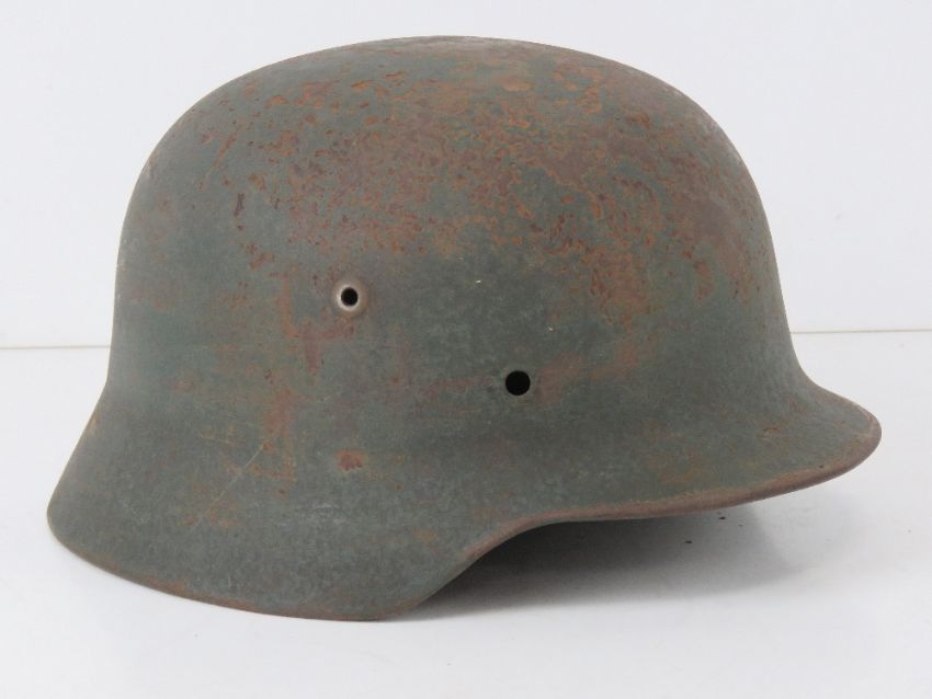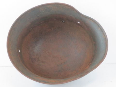 A WWII German helmet, liner deficient.