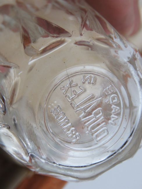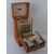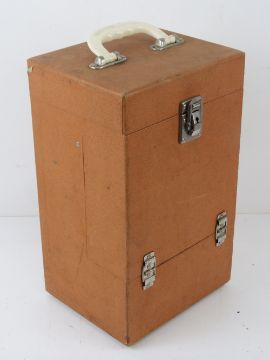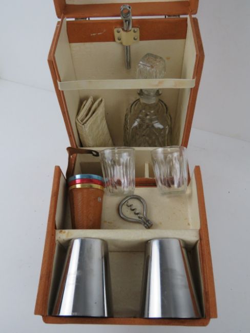 A rare Brexton leatherette covered car decanter set in original box, as retailed by Beards of Cheltenham, partially original contents including decanter, various cups, corkscrew, can opener. etc