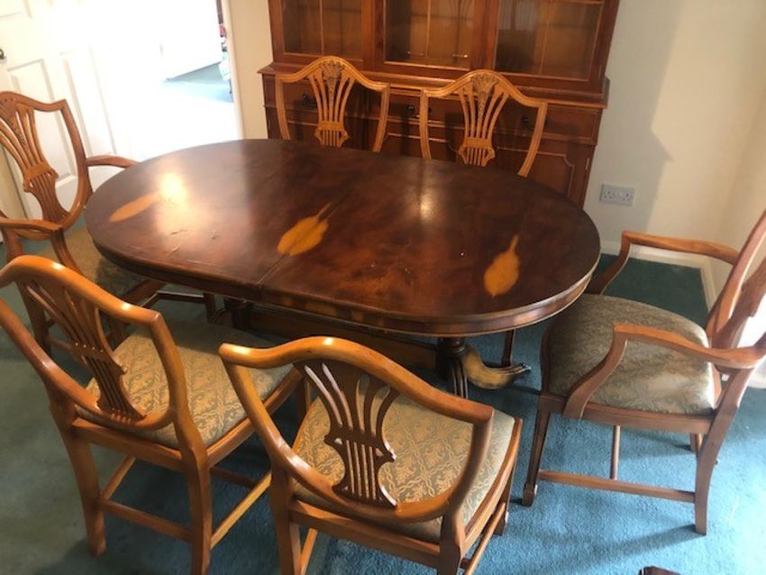 An oval Yew wood extending dining table (196 x 91cm extended) raised over twin pedestals, with six shield back chairs and a two sectional cabinet having three astral glazed doors over three drawers and three doors, approx 150cm wide x 193cm high. En Suite.
