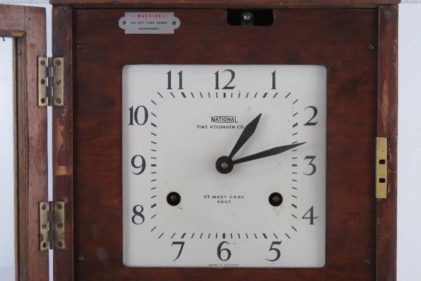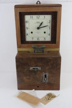 A National Time Recorder Company clocking-in machine, enamelled dial with Arabic numerals and marked St Mary Cray Kent upon, having twin winding apertures, key and pendulum and a small quantity of clocking-in cards, 36 x 31 (max) x 69cm