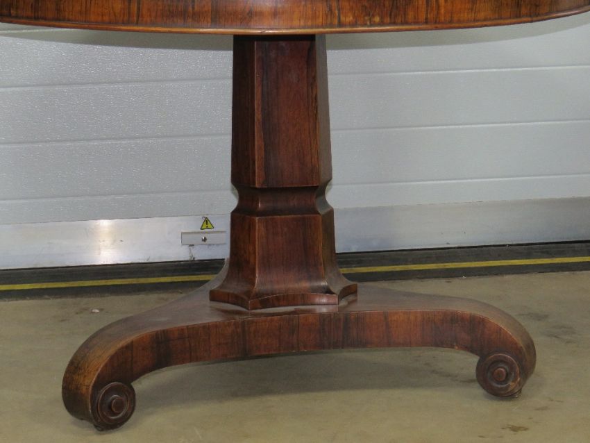 A Victorian circular rosewood breakfast or loo table raised over a hexagonal column upon triform base with concealed brass castors.