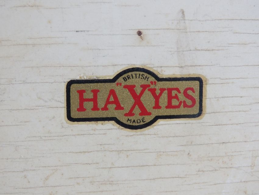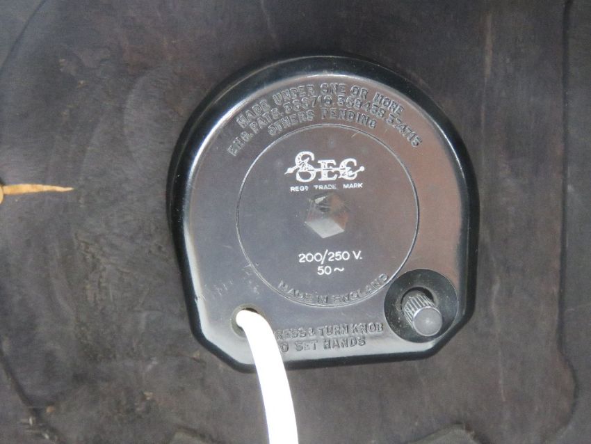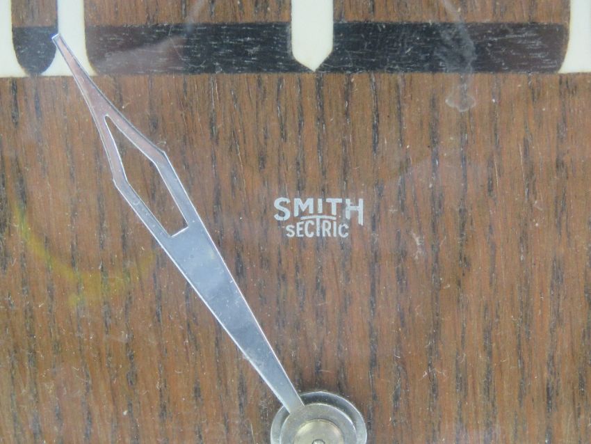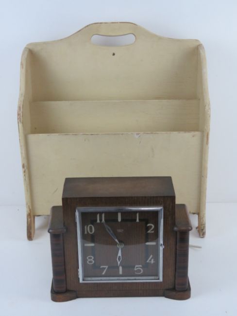 A vintage cream painted two sectional magazine rack bearing label 'British Made Haxyes' 41cm wide. Together with a Smith 'Sectric' Art Deco mantle clock. Two retro items.