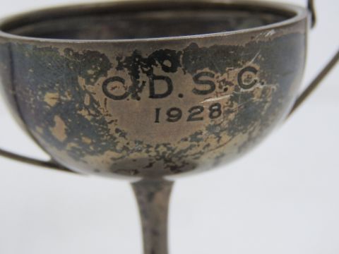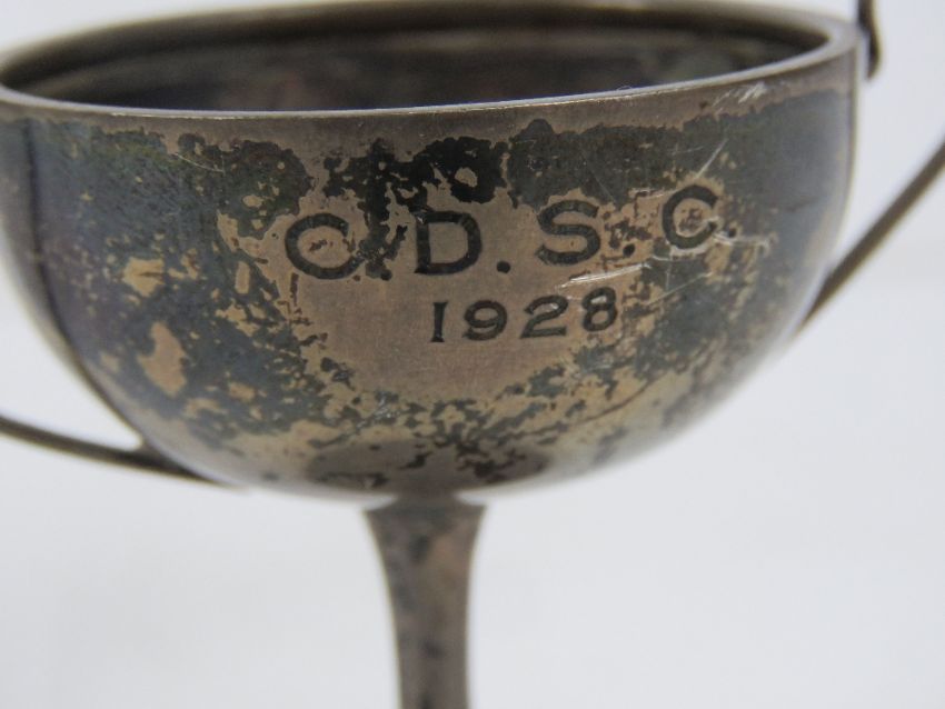 A HM silver trophy cup, together with a cut glass scent bottle having HM silver rim and a white metal and glass dressing table pot. Three items.