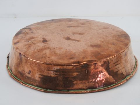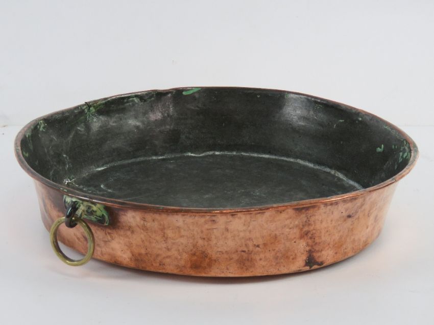 A copper pan having brass hanging hook, a/f, 32cm dia.