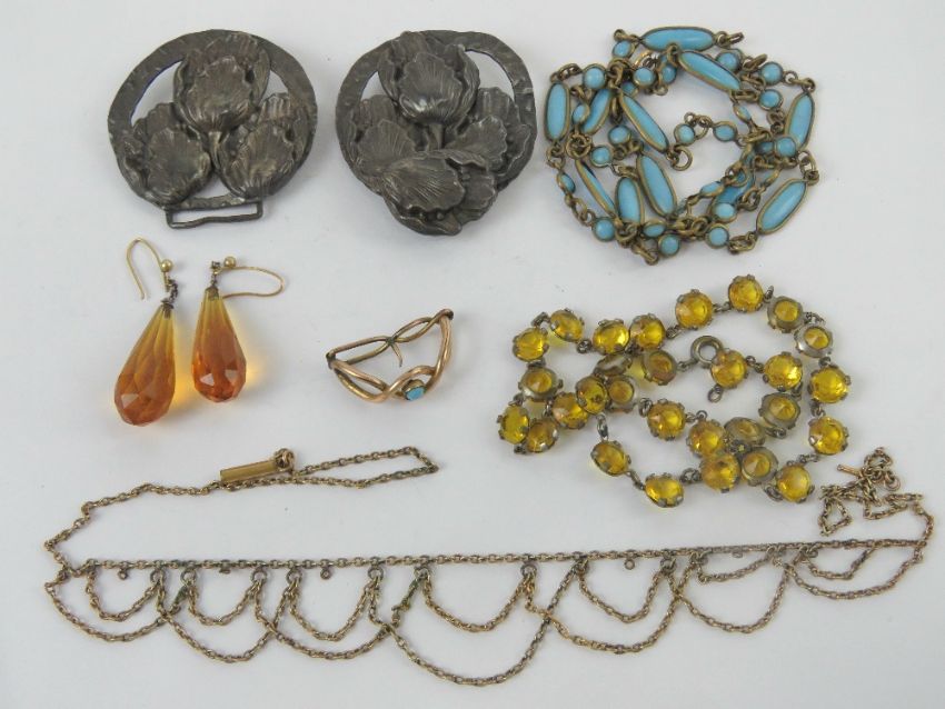A small quantity of finely made vintage jewellery; citrine glass drop earrings, an Art Nouveau belt buckle, a yellow glass necklace, an Edwardian chain necklace, a rolled gold and turquoise scarf clip and a long turquoise set chain necklace. Six items.
