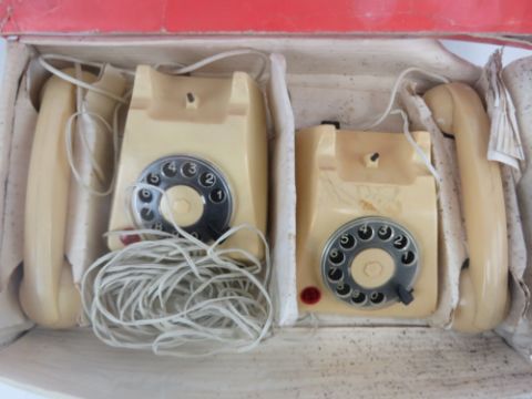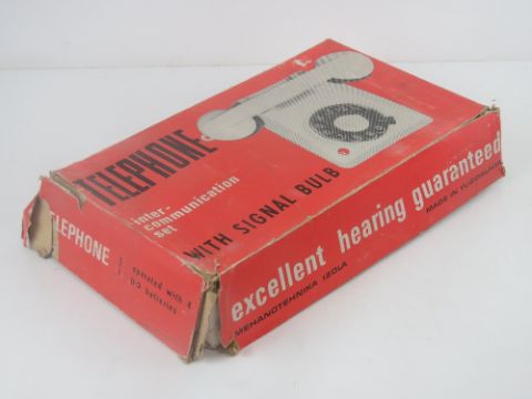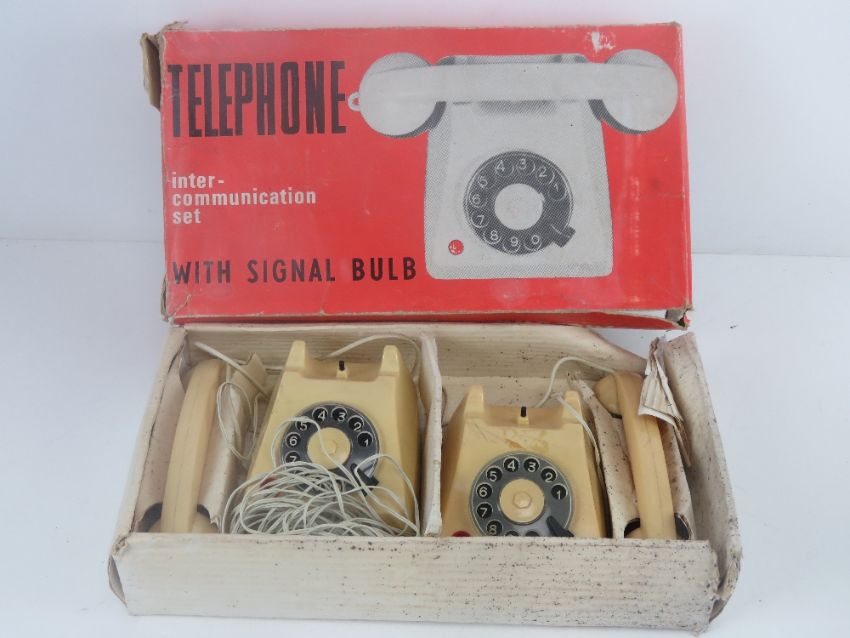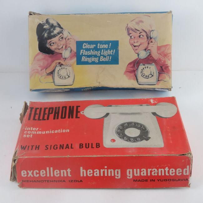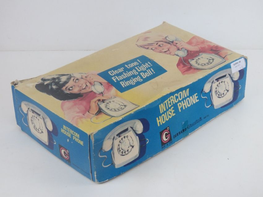 A Carraru Intercom house phone with 'clear tone, flashing light and ringing bell!', together with another boxed telephone intercommunication set 'with signal bulb'. Two items.