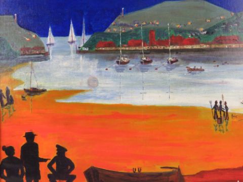 Oil and acrylic by Martino entitled 'Terrors come in Trios' harbour scene in moonlight with fishermen before and sailboats beyond, 60 x 50cm, framed.