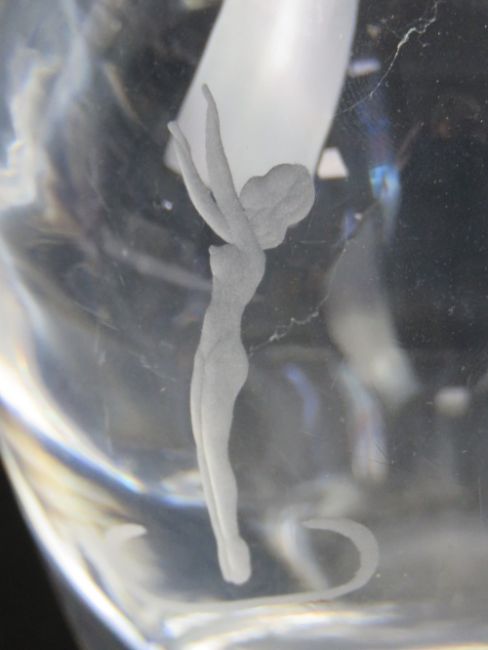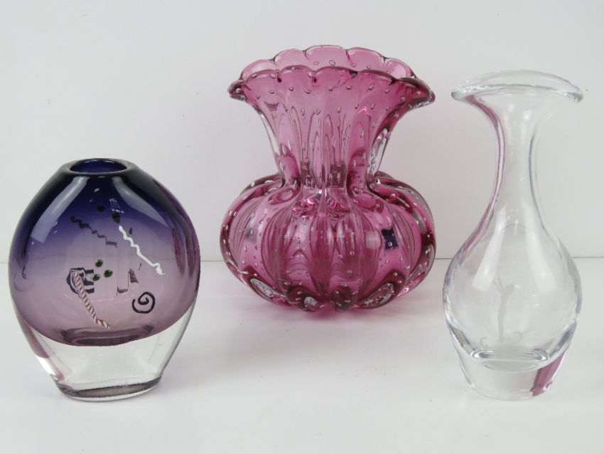Three assorted art glass vases; one having applied decoration marked Pearl Glassware Ltd, another having etched female nude and standing 17.5cm high.