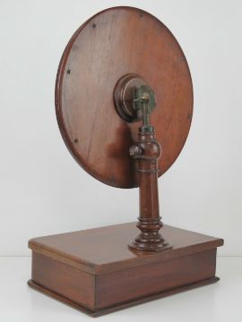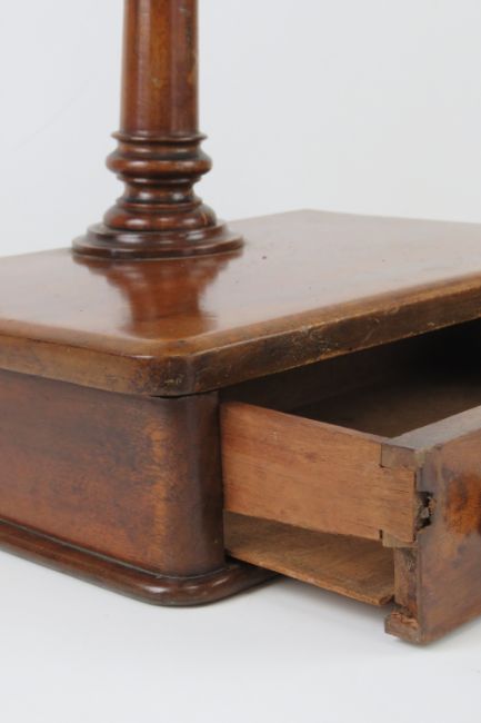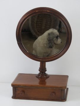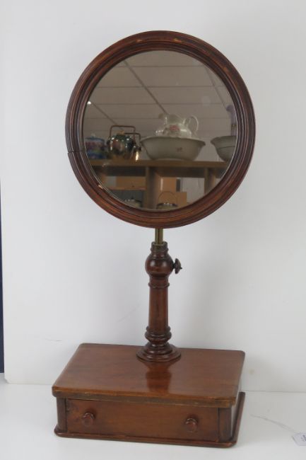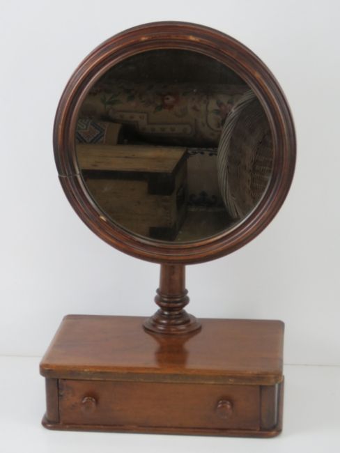 An unusual mahogany gentleman's shaving mirror having drawer under and adjustable round mirror having telescopic and tilt function, slightly a/f, 34.5cm wide, 56cm high.