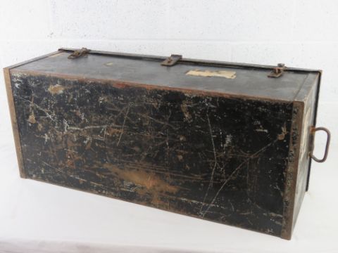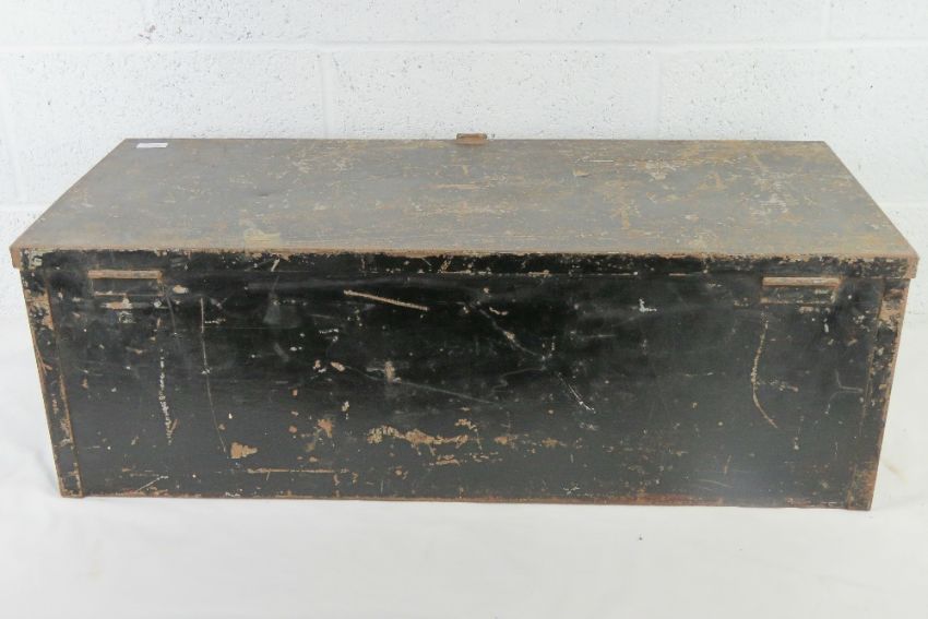 A metal travel trunk with clasp and end handles with original 'Cabin' label upon, 93 x 39 x 31cm.