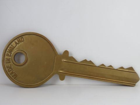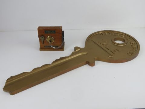 An oversized advertising shop window Yale key measuring 78 x 31cm. Having upon 'The Yale & Towne MFG Co' and 'Made in England' verso. Together with an oak Yale lock salesman's type display panel with captive key, 14 x 13cm. Two items.