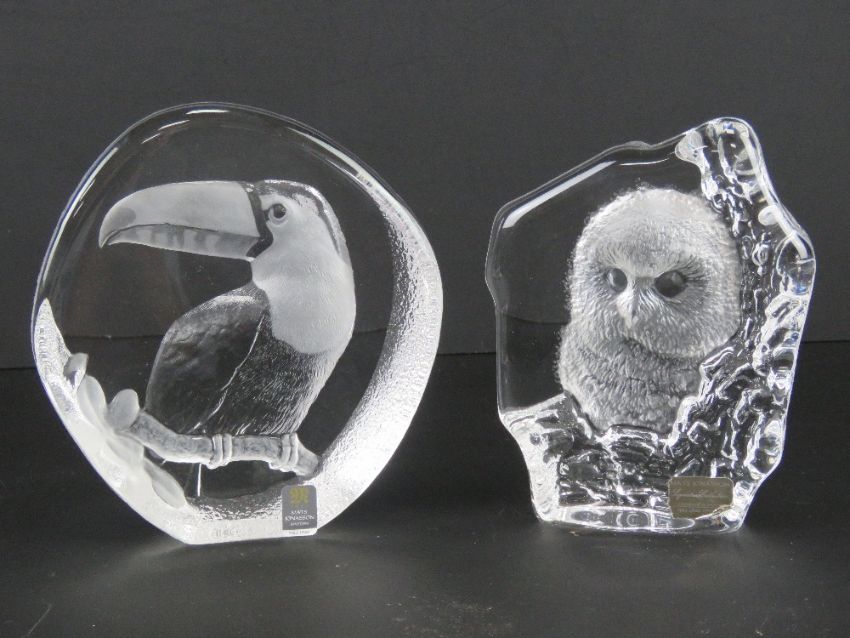 Mats Jonasson Swedish lead crystal paperweights; ornithology interest being a Toucan 13 x 13cm, and an Owlet 13 x 10cm. Two items.