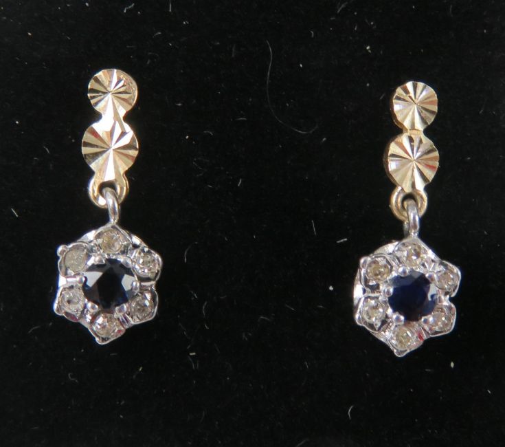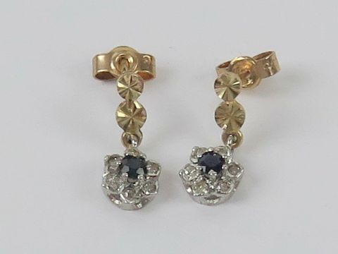 A pair of 9ct gold sapphire and diamond floral cluster earrings with butterfly backs, hallmarked to the post.