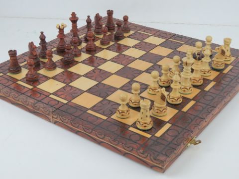 A contemporary travel chess set having carved wooden pieces within. Together with a vintage cribbage board.