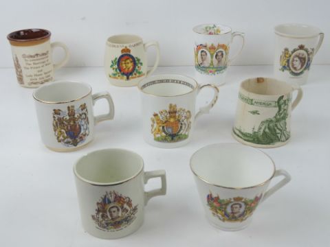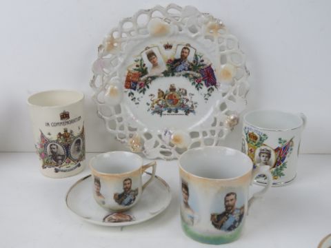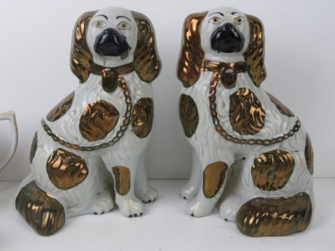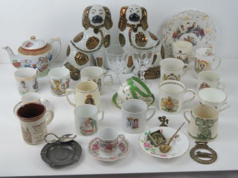 A pair of Staffordshire style seated Springer Spaniels, a/f. Together with a quantity of assorted ceramics and commemorative wares including George and Mary Jubilee 1935, Queen Alexandra badge, 1919 Victory mug, Queen Alexandra of Denmark mug, Edward VI items, etc.