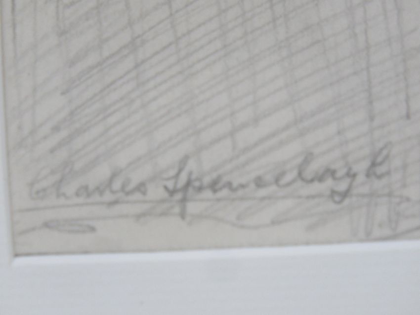 Charles Spencelayh (1865-1958) pencil sketch, 'The Seamstress' old lady sewing by gas light, framed and mounted, signed lower left, sight size 26 x 15cm.