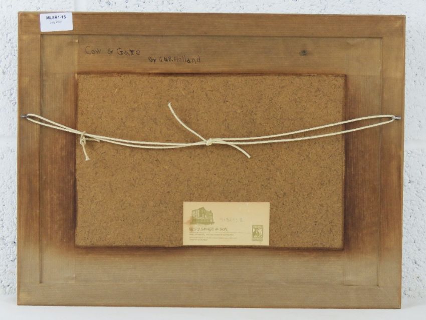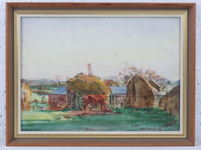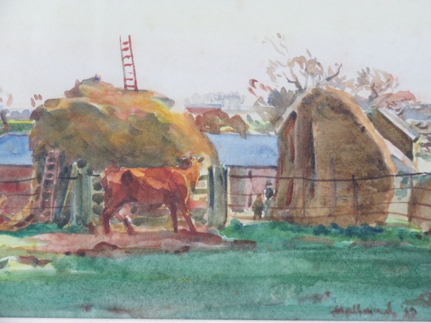 GHB (George) Holland (1901-1987), watercolour, study of a rural farm scene, cow before, hay rick and buildings beyond etc, entitled verso 'Cow and Gate', signed lower right and dated '39, framed, sight size 29 x 38cm.