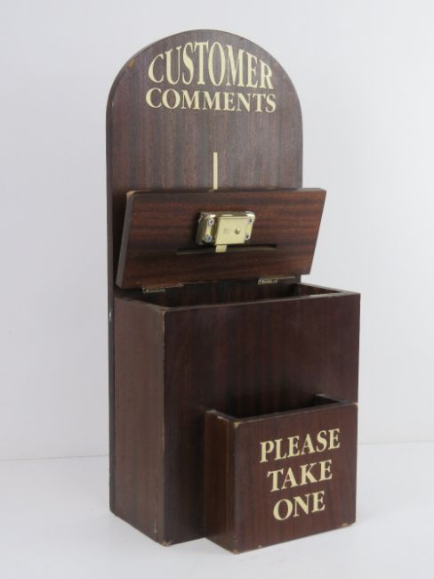 A 20th century mahogany 'Customer Comments' box, 58cm high.