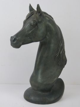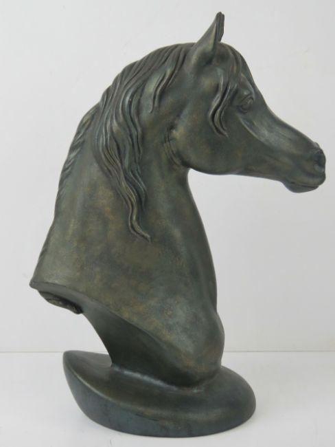 A ceramic sculpture of a horses head, bronzed effect, 39cm high.